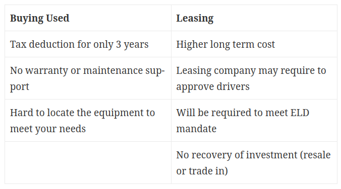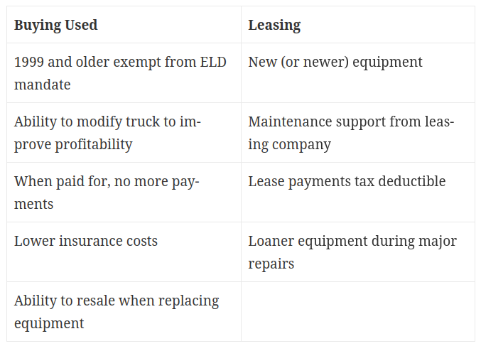 There are pros and cons to each. Buying vs Leasing has been debated for as long as I can remember. There are many factors when deciding between buying vs leasing including taxes, maintenance, length the equipment is expected to be in the fleet, leasing companies driver requirements and many more. The fast answer is buying used equipment is best. In the long run it gives you more profitability and versatility. In the short term you may (but not always) have a greater out of pocket expense. However, many companies choose leasing over buying to operate new equipment for a lower cost.